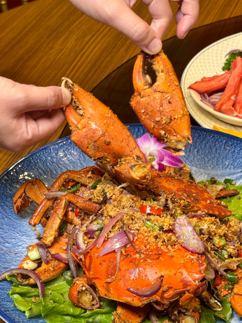 類避風塘的做法連蟹殼都超香,上桌畫面大器!蟹腳有先處理筷子撥開就可以直接吃,蟹肉飽滿紮實