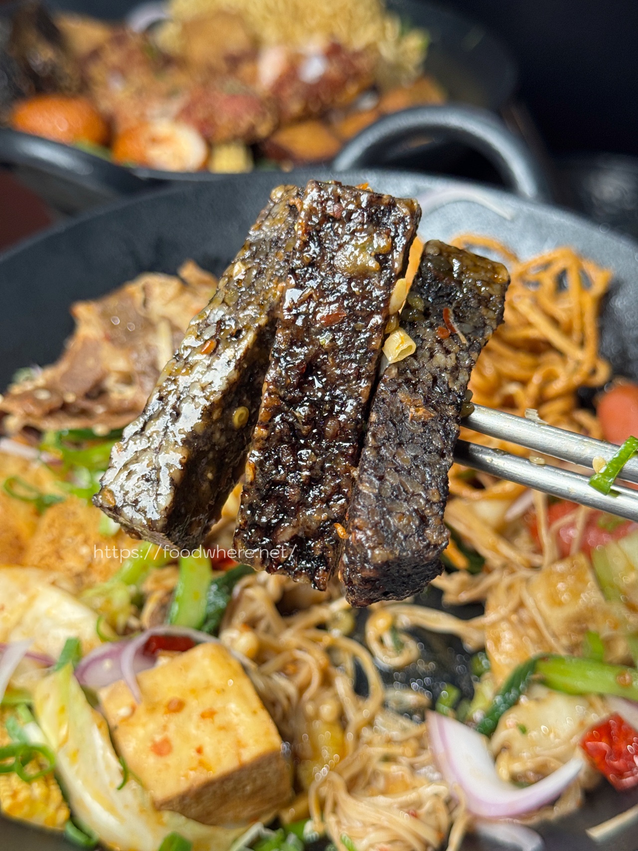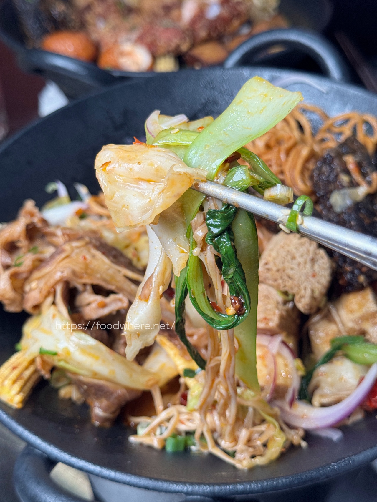 我第一次看到乾鍋裡直接放整塊雞排真的有驚艷到。點了他們的招牌「脆皮G排 $99」,一上桌就是炸到金黃酥脆的雞排直接鋪在鍋面上!而且這邊的每一份鍋都是現點現炒,師傅用大火爆炒,炒出那種香氣四溢的「鍋氣味」,你一聞就知道這鍋一定好吃。