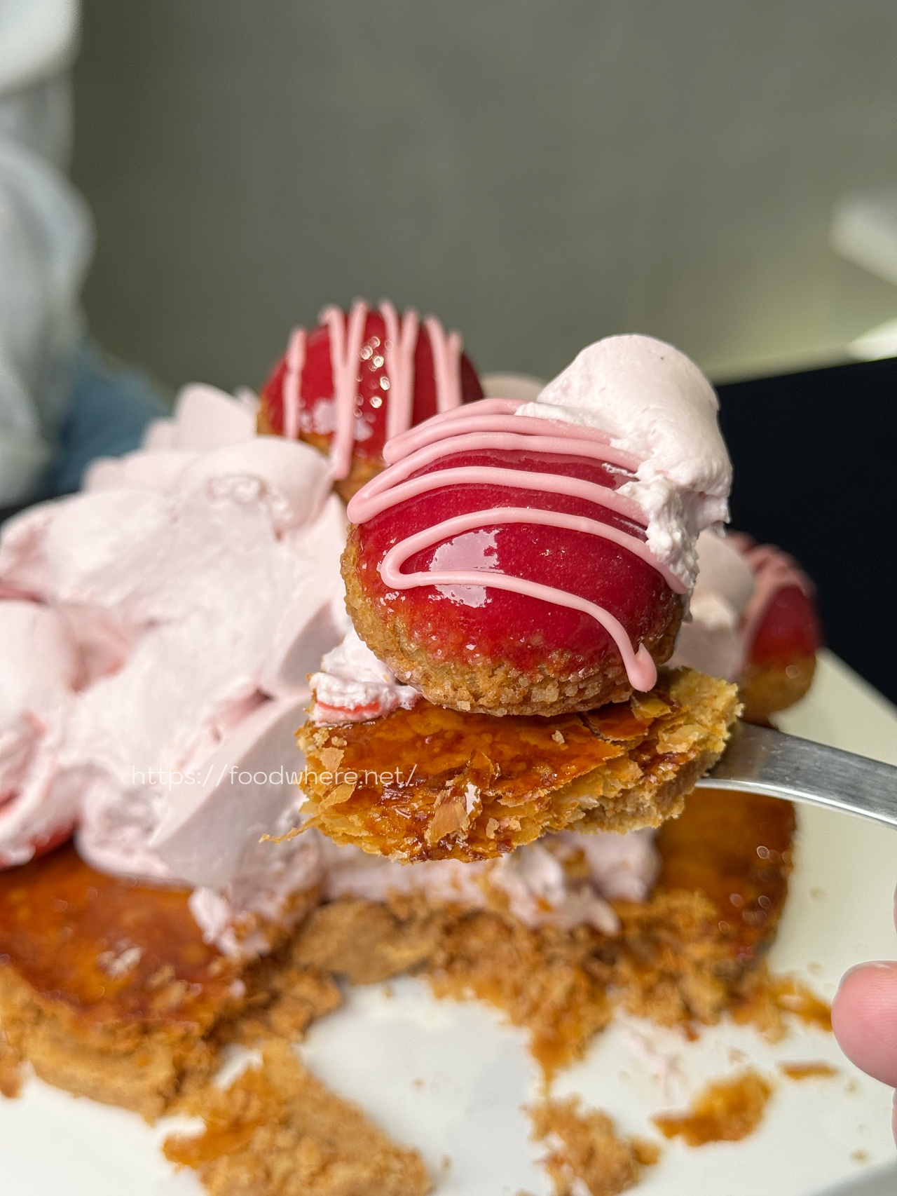 上層綻放著如花朵般的覆盆子奶霜,粉嫩的水蜜桃馬卡龍與覆盆子泡芙圍成圈,我只能說完全不失rawstone以往的高水準!馬卡龍沾著覆盆子奶霜,口感輕盈更增加清爽的微酸感,泡芙裡頭也是藏著滑順的覆盆子奶霜,奶霜中間還藏著口感水潤的高山水蜜桃,底層焦香酥脆的焦糖千層酥與碎餅乾底,整款蛋糕呈現的溫柔細膩又富有層次
